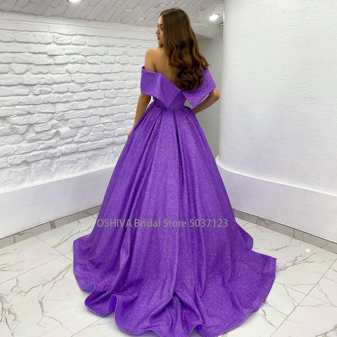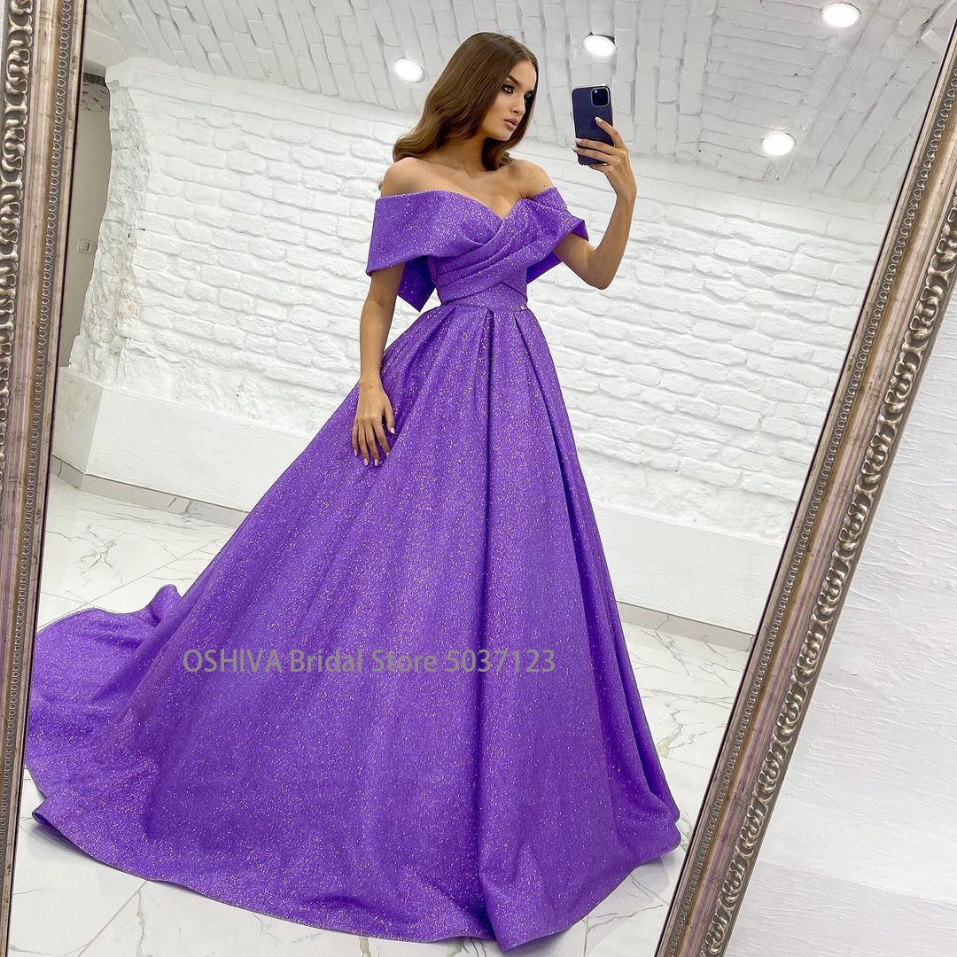 Sparkly Bright Purple Evening Dresses Elegant Off Shoulder Pleated neckline Ball Gown Party Evening Prom Gowns
