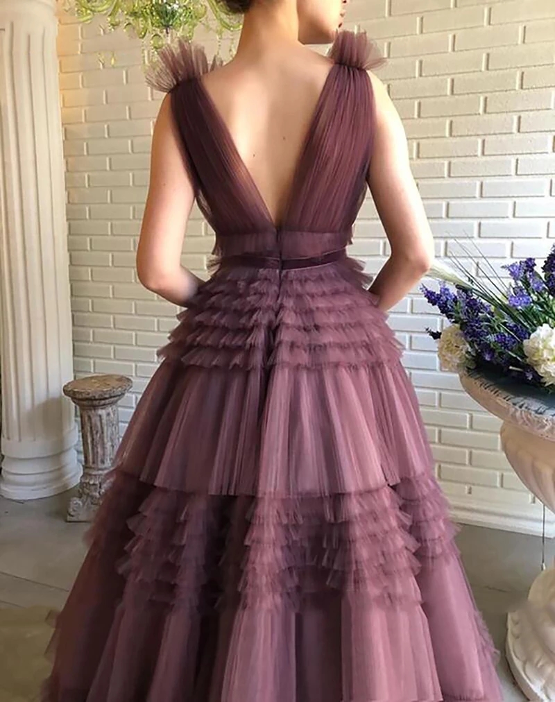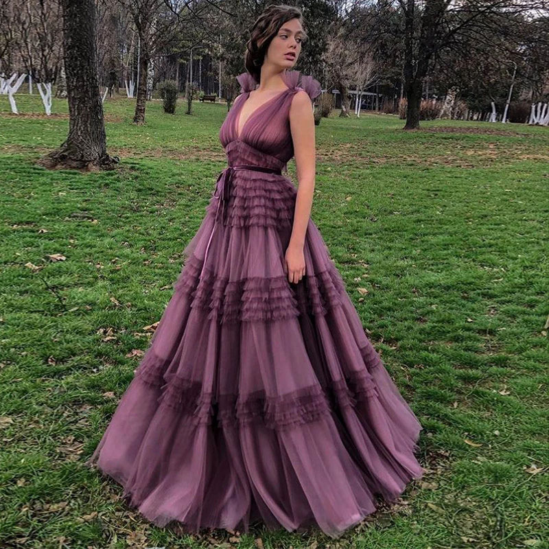 Stunning Evening Dresses V-Neck Backless Tulle Ruffles Mono Draped A-LINE Floor-Length Party Dress