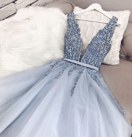 V Neck V Back Long Prom Dresses with Appliques