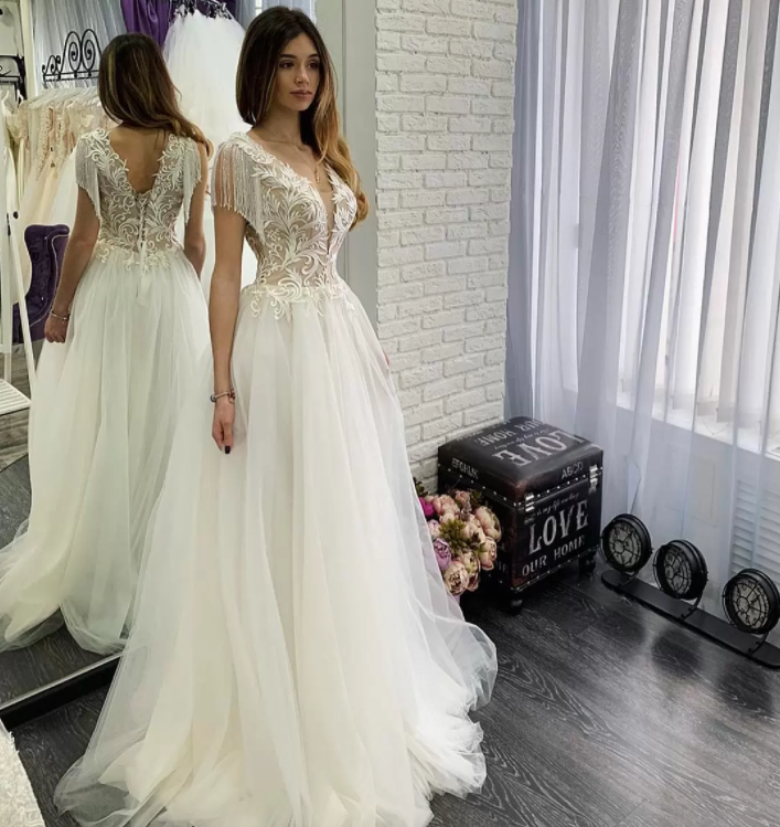 Boho Wedding Dresses V Neck Lace Appliques Cap Sleeves Tassel Sweep Train Beach Bridal Gowns Wedding Dress