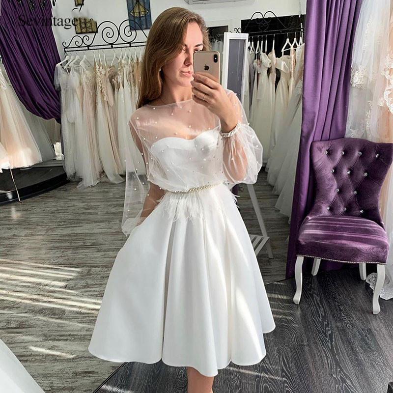 Cheap Satin Short Wedding Dress Boho 2 Pieces Knee Length Pearls Bridal Gowns