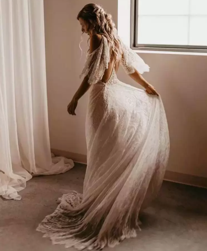 Boho Lace Wedding Dresses Sexy Backless Chapel Train Short Sleeves Off the Shoulder Wedding Bridal Gown