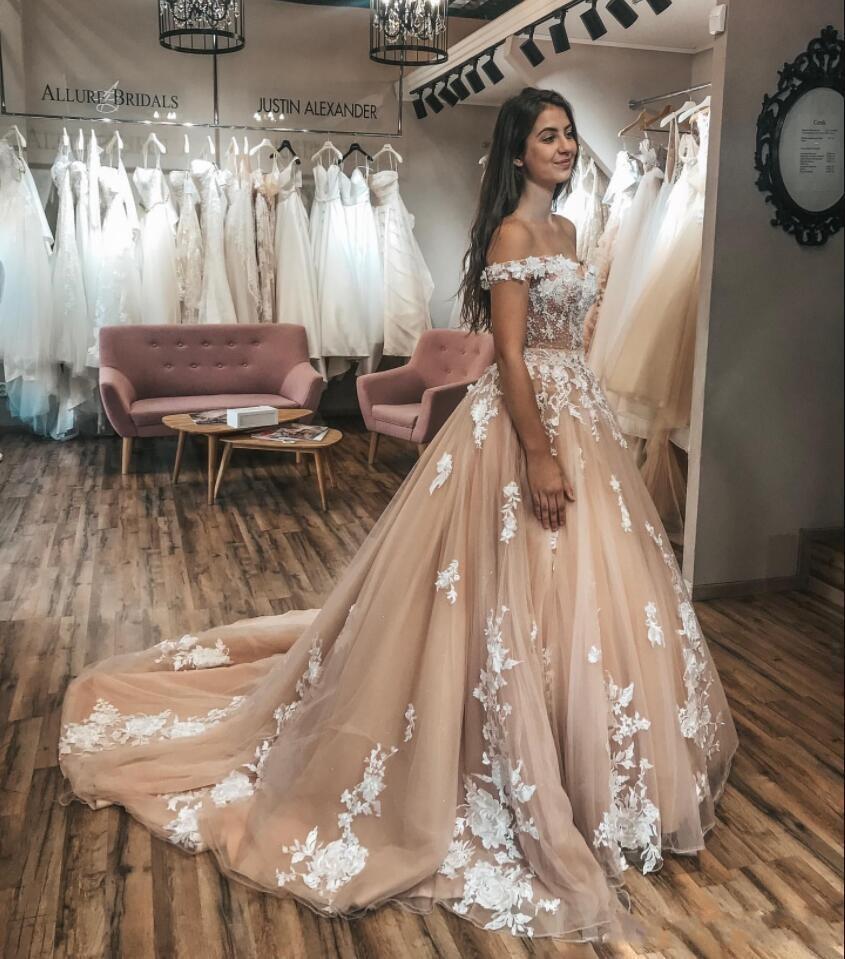 Off Shoulder Champagne Princess Wedding Dresses Lace Applique off shoulder Ball Gowns Boho Cheap Wedding Bridal Gowns