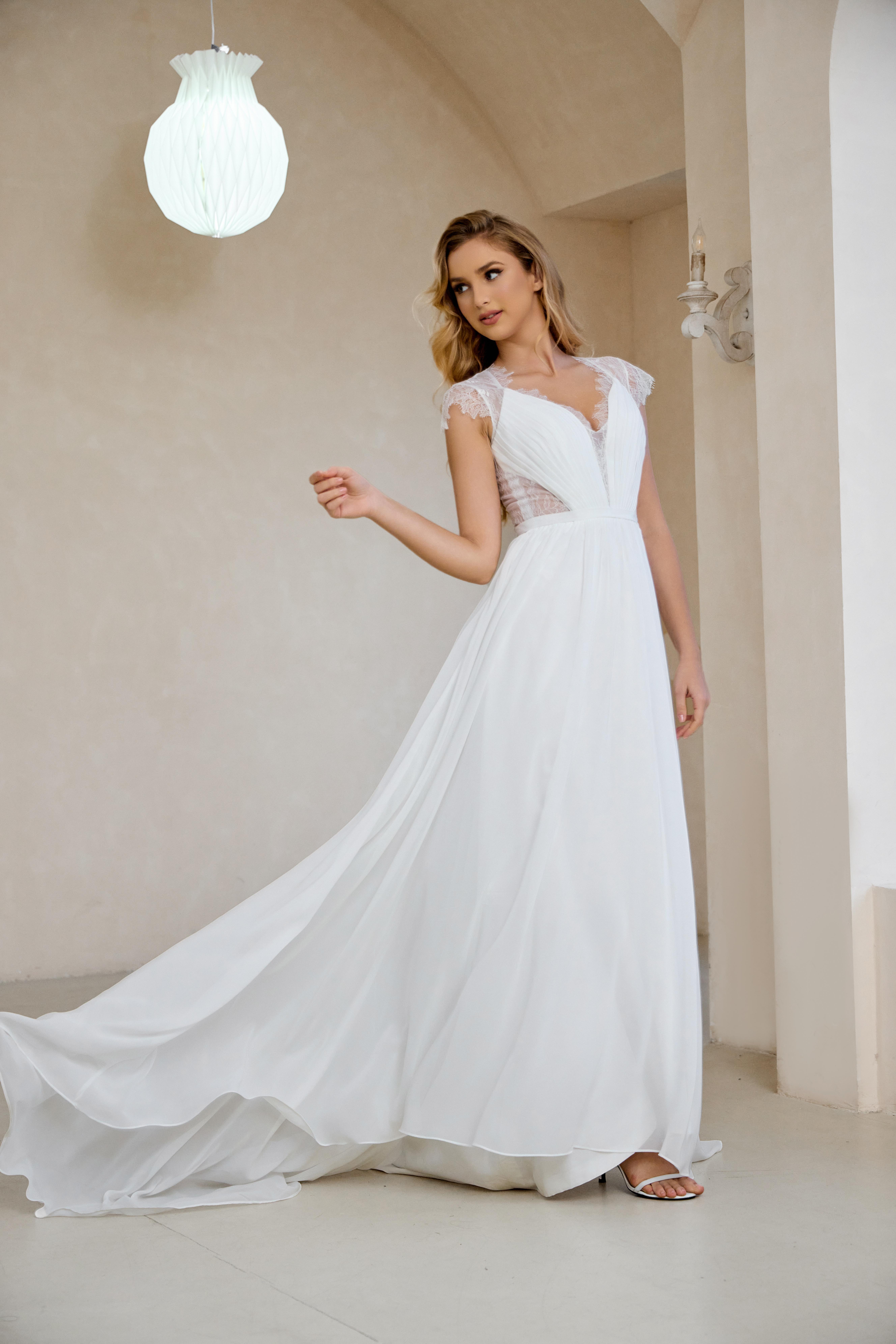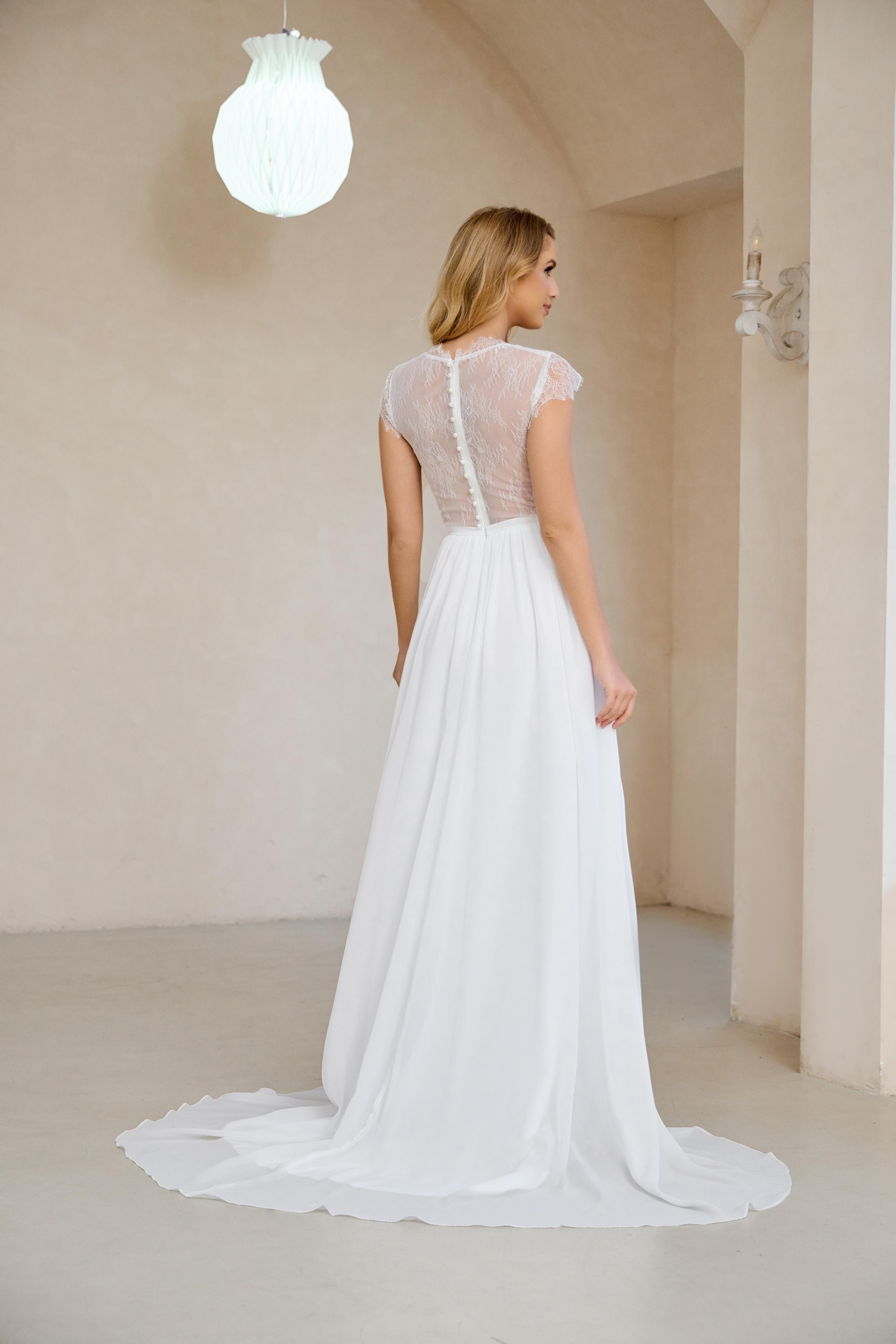 Boho Wedding Dress V-Neck Lace Chiffon A Line Wedding Dress Cap Sleeves Illusion Back Beach Bridal Dress