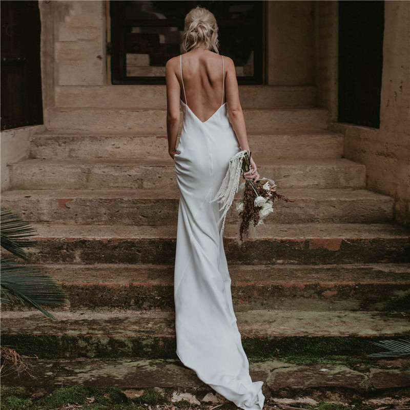Simple Mermaid Boho Wedding Dresses Sexy Backleess Spaghetti Strap Satin Chiffon Bridal Gowns