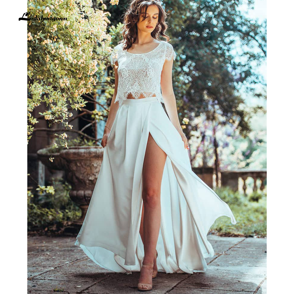 Two Pieces Bridal Gowns Side Slit A Line Lace Wedding Dresses Beach Short Sleeves A Line Garden Long Wedding Dress