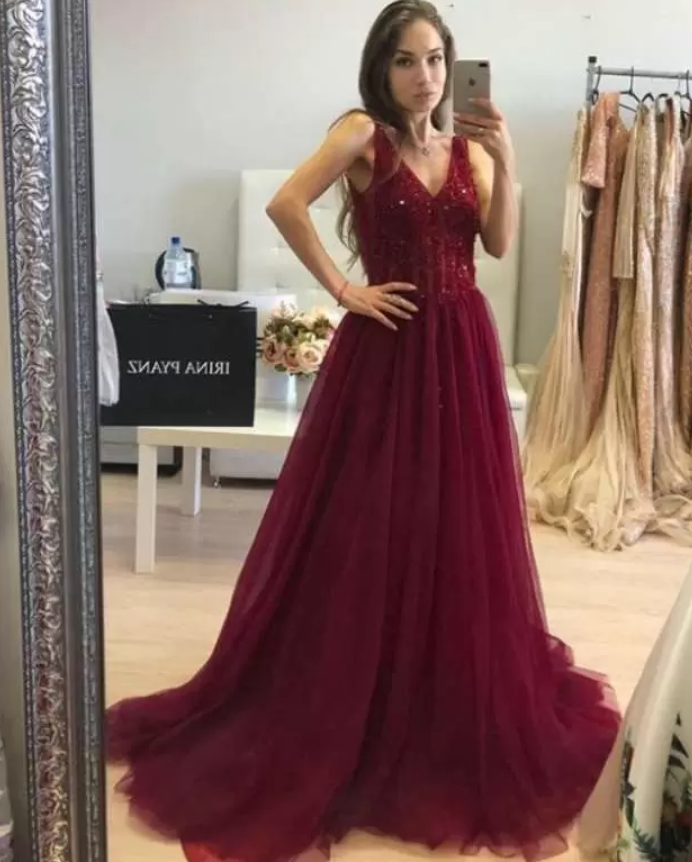 A-line V Neck Backless Prom Dresses Sleeveless Court Train Beads Black Tulle Side Split Party Formal Dress