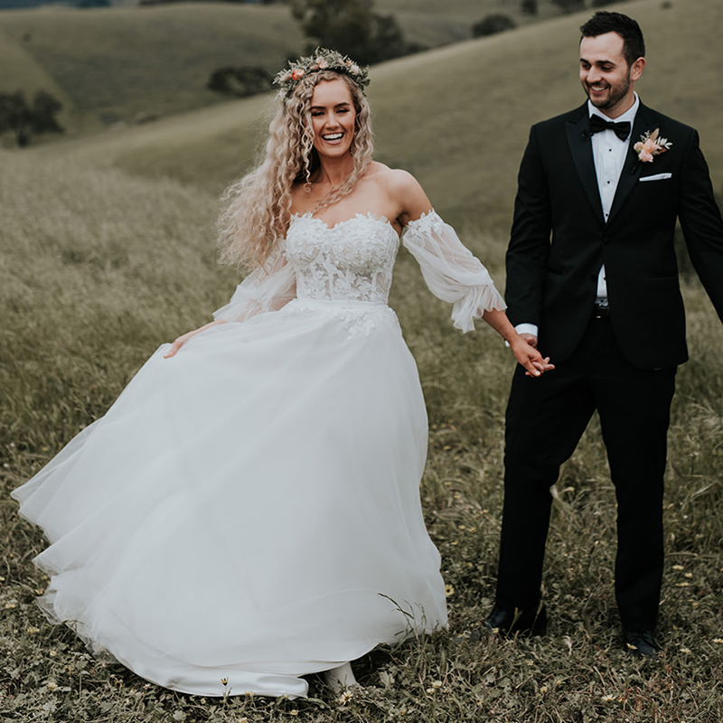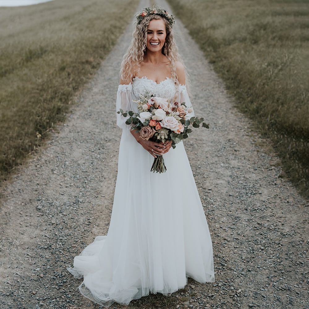 Sweetheart Wedding Dress Boho Tulle Backless Strapless Puffy Sleeves Off Shoulder Lace Bride Gown