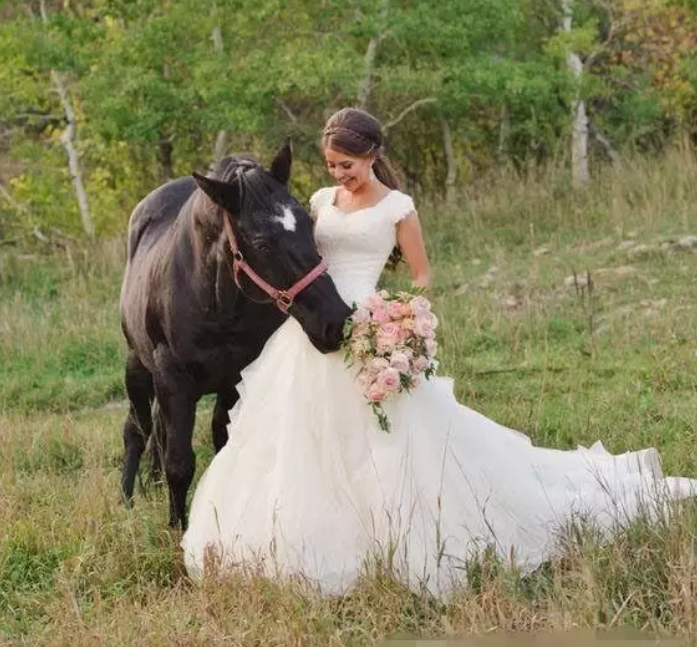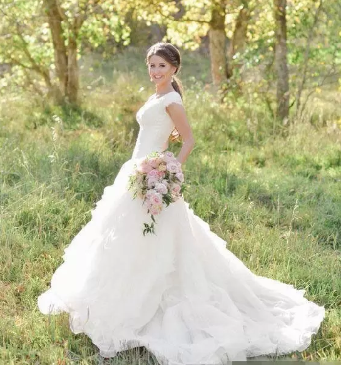 A Line Country Wedding Dresses Organza Lace Applique Short Capped Sleeves Tiered Skirt Wedding Gowns
