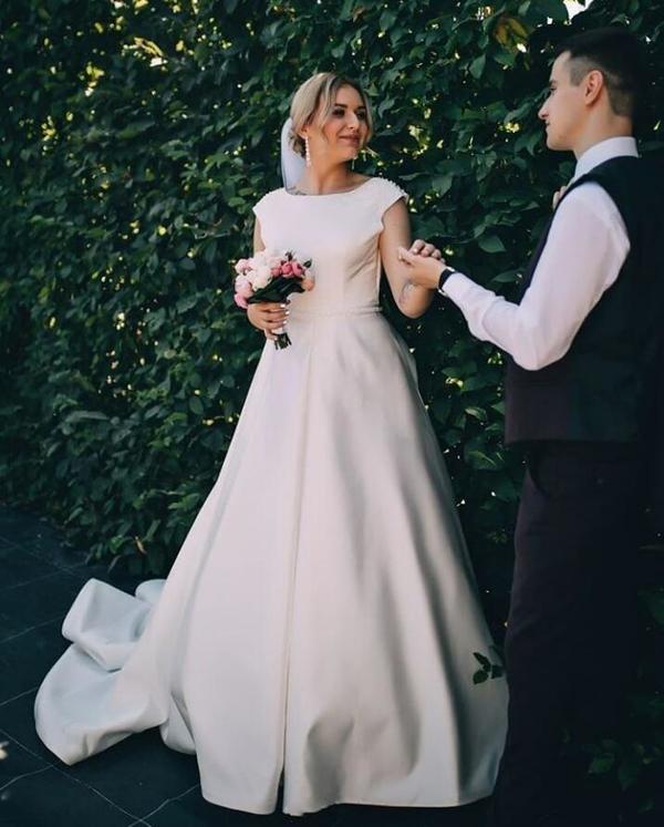 Romantic Scoop Neck Backless A Line Plus Size Bridal Wedding Dress Sweep Train Satin Wedding Gowns