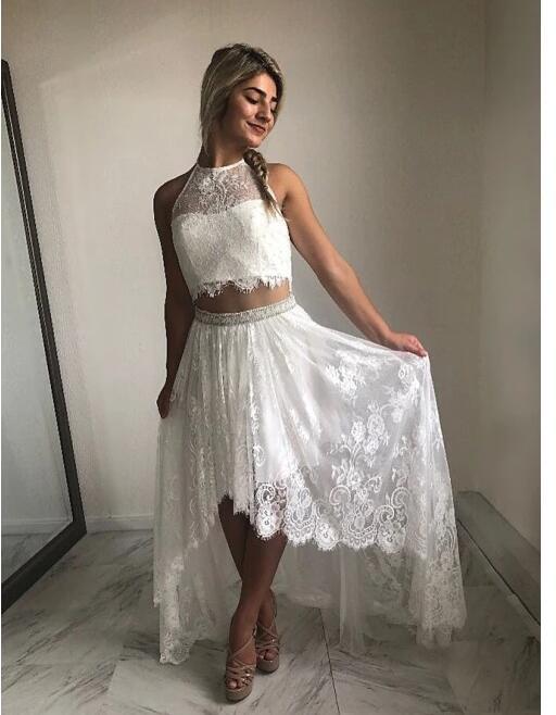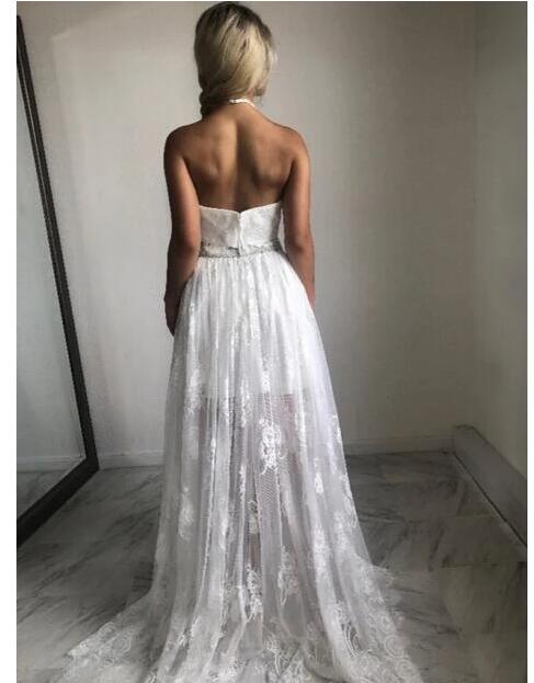 Flowy Halter Lace Crop Top Boho Beach Two Piece Wedding Dress