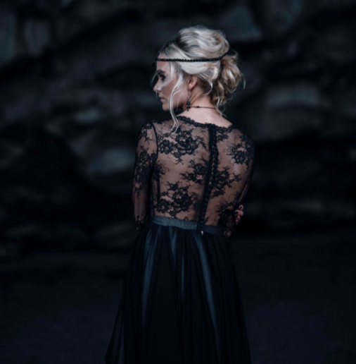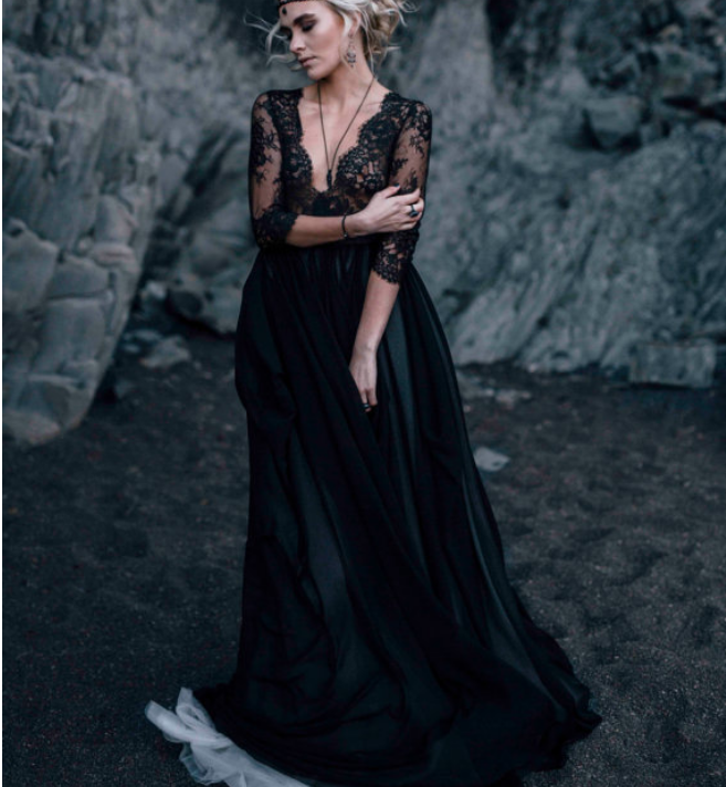 Black lace deep v-neck wedding dress with long sleeve scalloped bodice