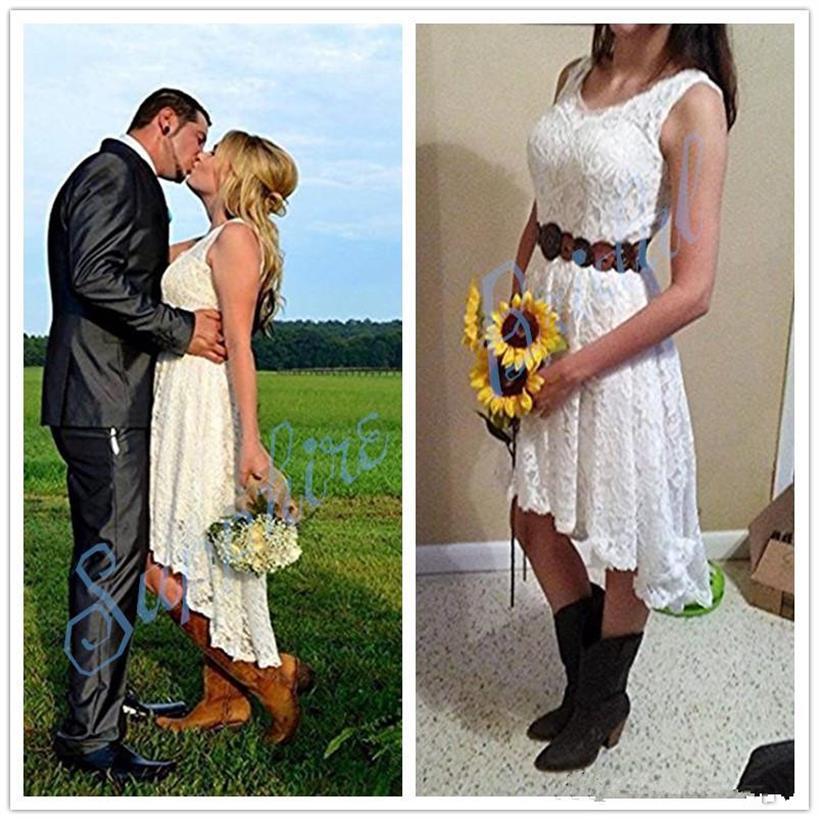 Little White Dress Vintage High Low Beach Wedding Dresses Full Lace V-neck Bohemian Western Country Cowgirls Bridal Gowns