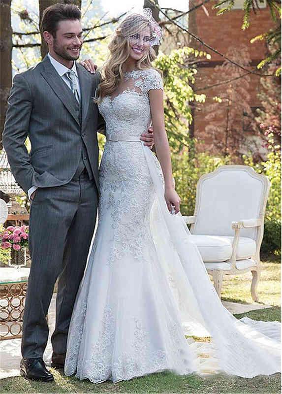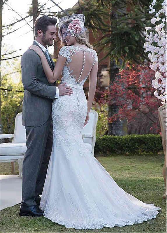 Ball Gown Wedding Dresses double shoulder crew neck short sleeve slim fit lace small tail fishtail wedding dress