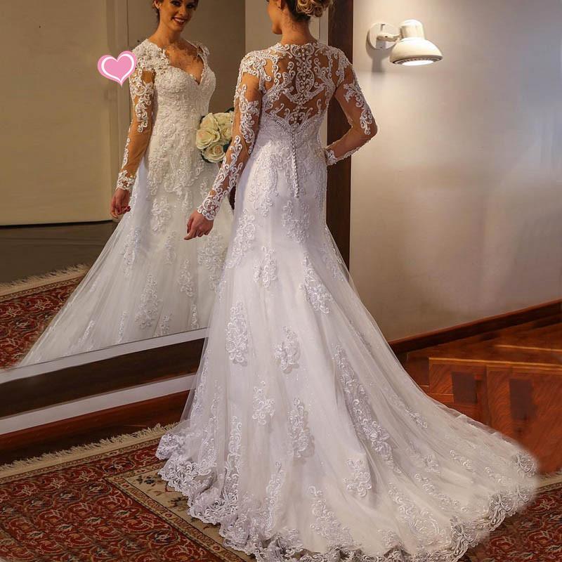 Sexy Deep V neck Long Sleeve Wedding Dress Mermaid Sequin Lace Trumpet Bridal Gowns
