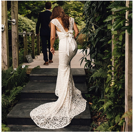 Empire Waist Floral Lace Backless Wedding Dress Cap Sleeves Bow Low Cut V Neck Mermaid Bridal Gowns