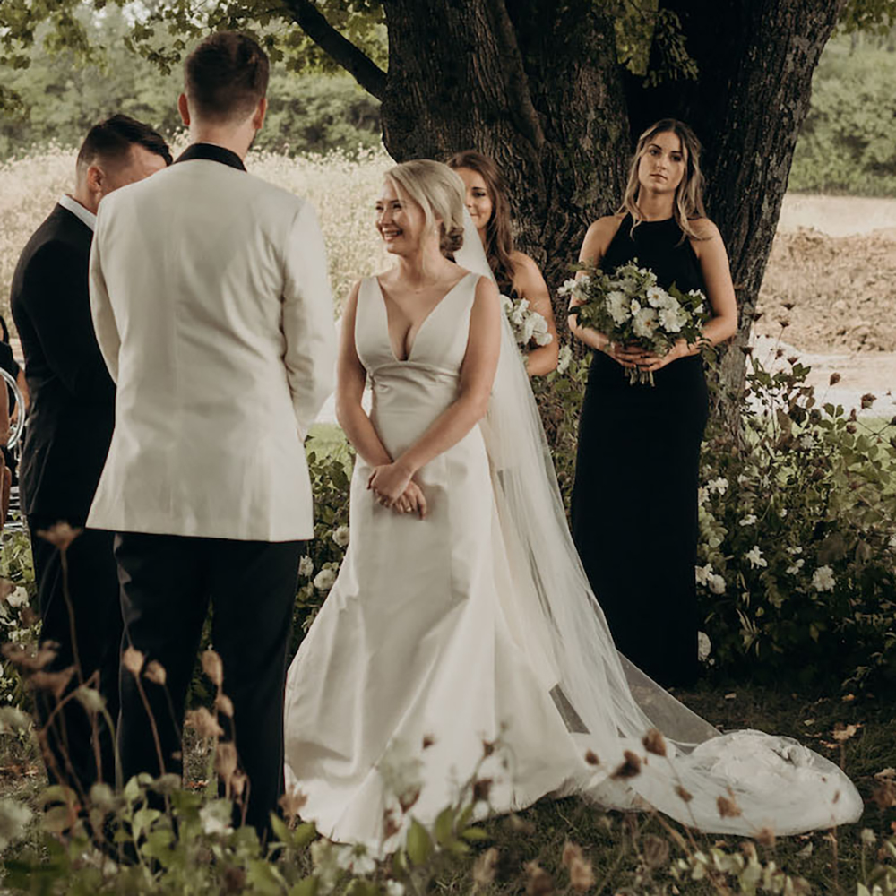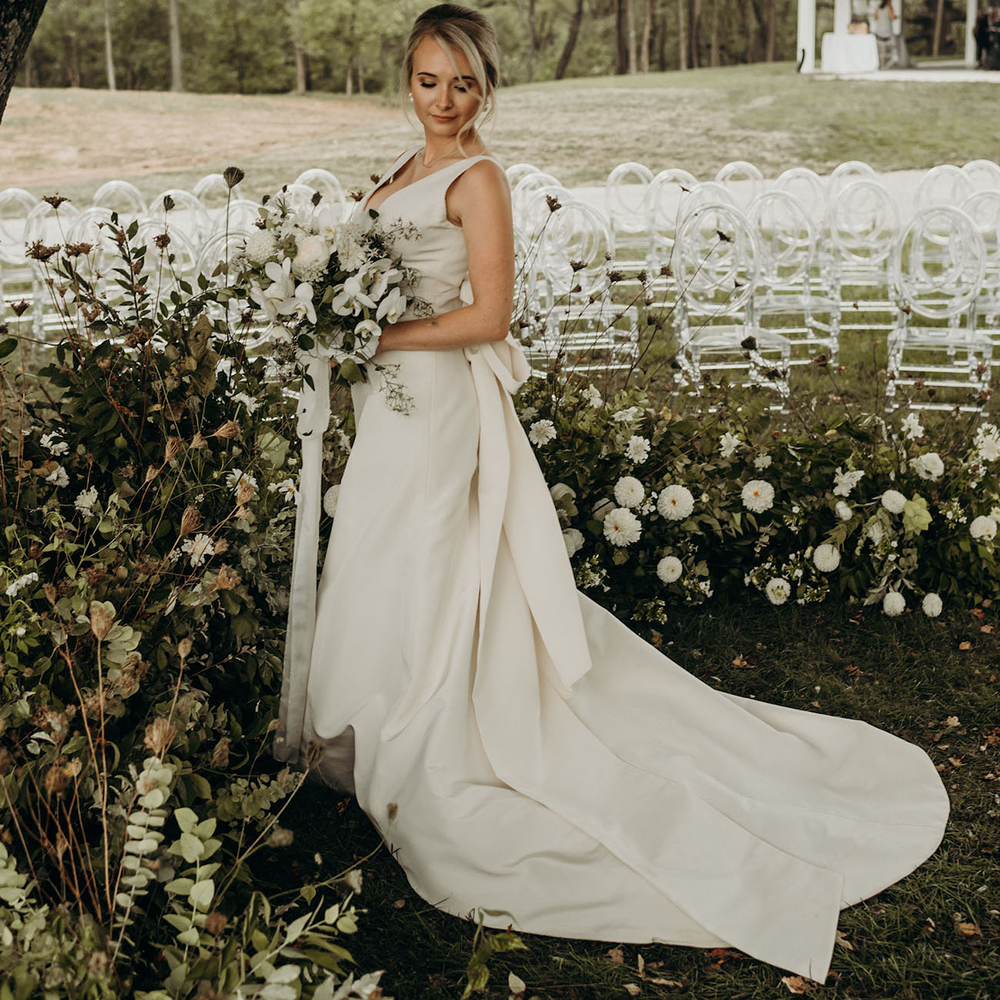 A Line Satin Minimalist V Neck Wedding Dress Ivory Chapel Train Simple Bridal Gowns