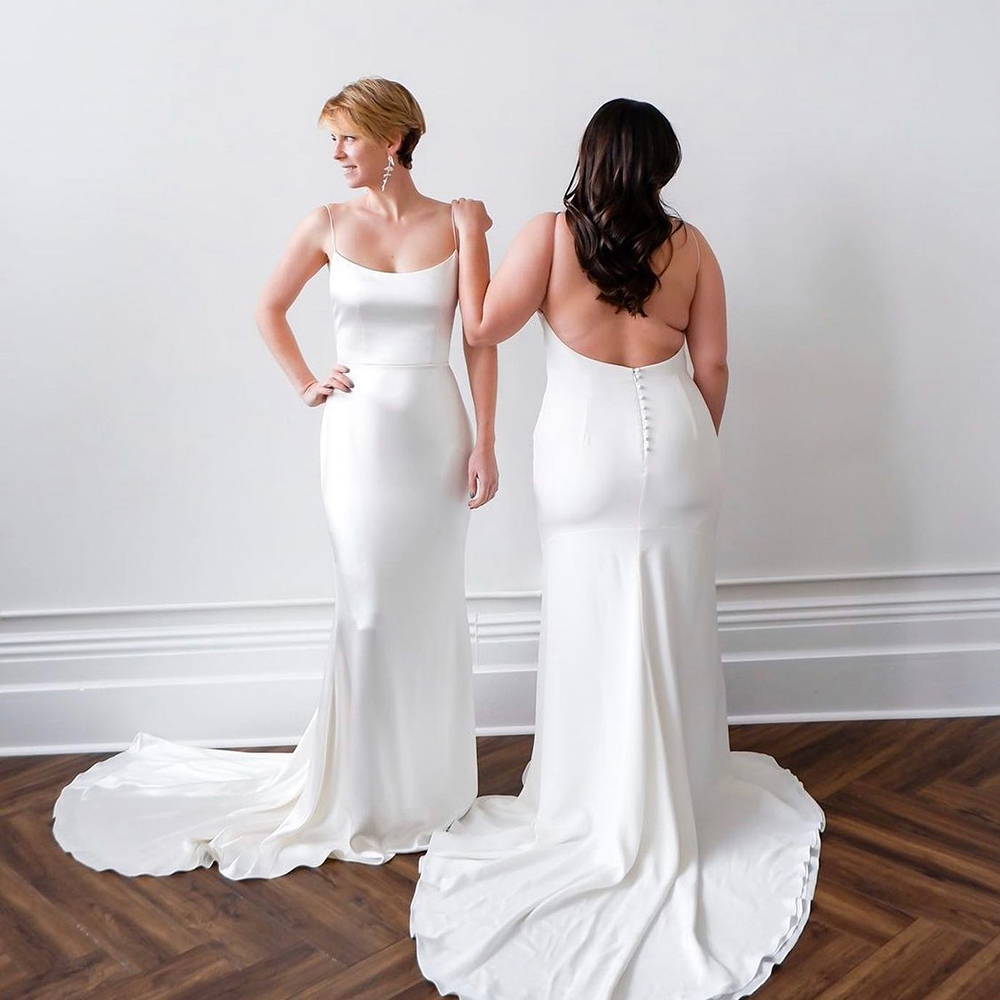 Scoop Neckline Fitted Satin Wedding Dress Custom Made Structured Bodice Backless Matte Spagghetti Straps Buttons Bridal Gown