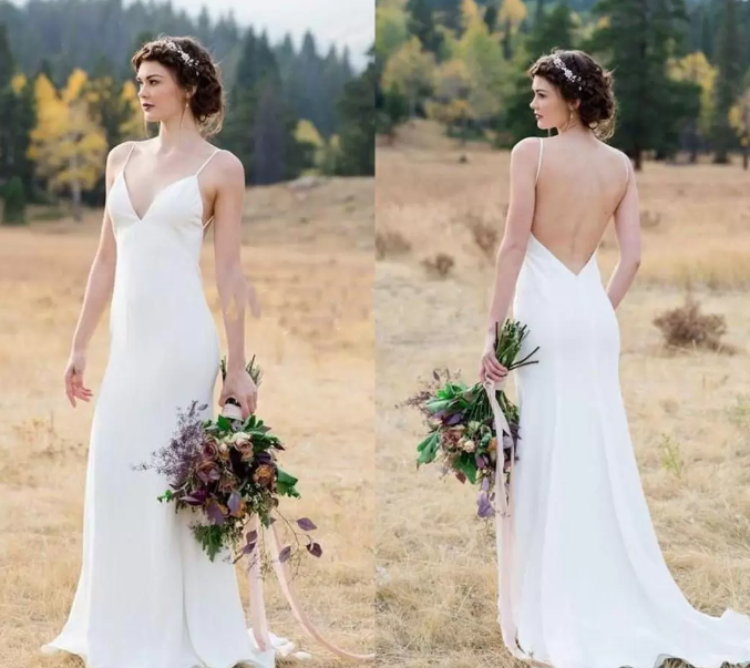Country Boho V Neck Backless Sweep Train Garden Beach Stain Bridal Gowns