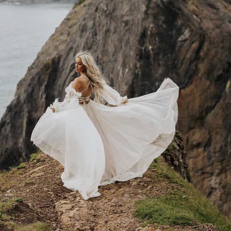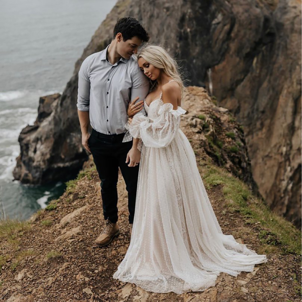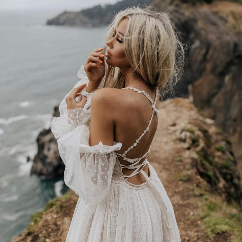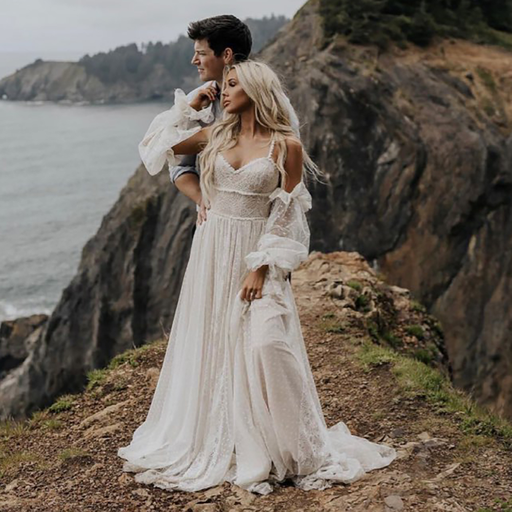 Boho Spaghetti Straps Elopement Wedding Dress Backless Corset Polka Dotted Lace Long Detachable Sleeves Backless Bridal Gown
