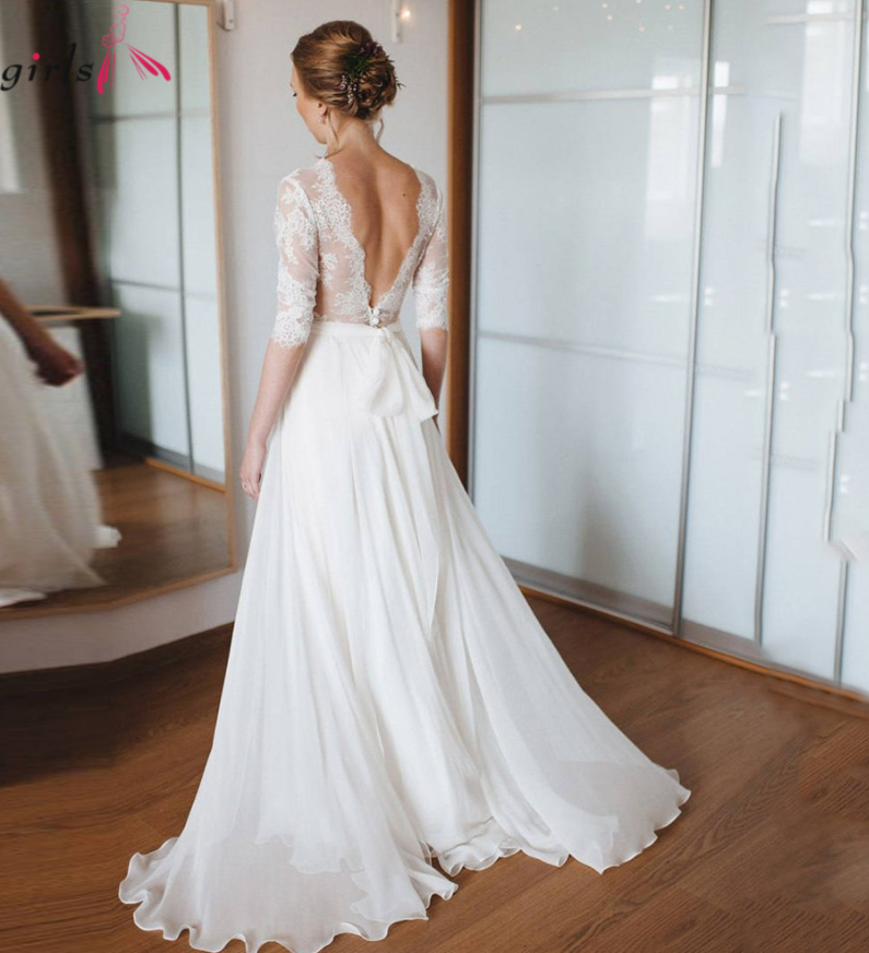 Elegant appliques lace long Illusion v-neck half sleeve chiffon robe Simple deep v back Wedding Dress