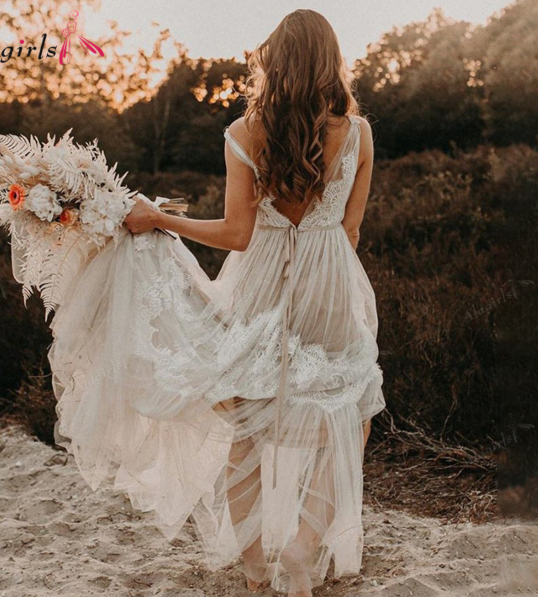 Sexy V Neck Wedding Dress Elegant Bridal Gown elegant Long Tulle Beach Wedding Dress