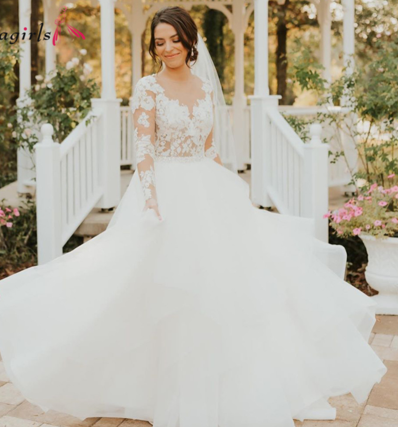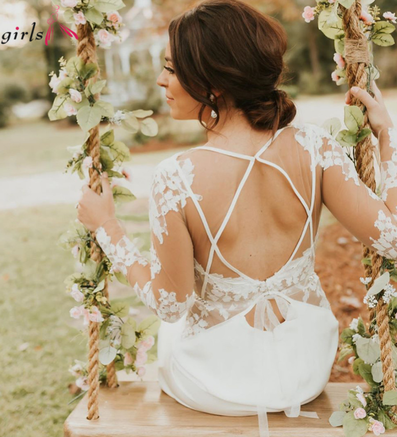 Simple Wedding Dress Appliques Sexy Backless Illusion Sleeves Bride Dress